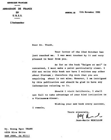 Và trích trang 623 nguyên văn thơ ông Jean Marie Mérillon gởi Giáo sư tiến sĩ Hoàng Ngọc Thành, đã được sách Ki tô giáo : Từ thực chất đến huyền thoại đăng lại nơi trang 237 do Văn Hóa xuất bản, Văn Nghệ phát hành năm 1996 tại Hoa Kỳ, do Nguyễn Hồng Ngọc viết và báo Văn Nghệ Tiền Phong 464, phát hành năm 1995 tại trang 85 do ông Lê Xuân Nhuận viết như sau : Répuplique Française -------------- Ambassade De France En Moscou, 12th November 1990 U.R.S.S -------------- L'Ambassadeur Dear Dr. Thanh, Your letter of the 22nd October has just reached me. I was most touched by it and very pleased to hear from you. As fas as the book “Saigon et Moi” is concerned, I must make a point particularly clear. I did not write this book nor have I written any other about Vietnam; therefore the work that you are enquiring about is not mine. However, I am intrigued by this publication and should be glad to have any information relating to it. Should I visit California, I shall not fait to take advantage of your kind invitation to a Vietnamese dinner. Wishing your new book every success, I remain.