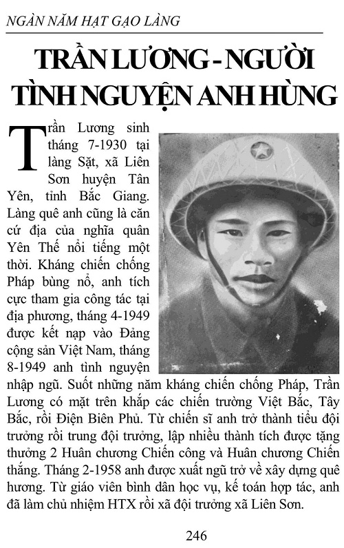 Trần Lương sinh tháng 7-1930 tại làng Sặt, xã Liên Sơn huyện Tân Yên, tỉnh Bắc Giang. Làng quê anh cũng là căn cứ địa của nghĩa quân Yên Thế nổi tiếng một thời. Kháng chiến chống Pháp bùng nổ, anh tích cực tham gia công tác tại địa phương, tháng 4-1949 được kết nạp vào Đảng Cộng sản Việt Nam, tháng 8-1949 anh tình nguyện nhập ngũ. Suốt những năm kháng chiến chống Pháp, Trần Lương có mặt trên khắp các chiến trường Việt Bắc, Tây Bắc, rồi Điện Biên Phủ. Từ chiến sĩ anh trở thành tiểu đội trưởng rồi trung đội trưởng, lập nhiều thành tích được tặng thưởng 2 Huân chương Chiến công và Huân chương Chiến thắng. Tháng 2-1958 anh được xuất ngũ trở về xây dựng quê hương. Từ giáo viên bình dân học vụ, kế toán hợp tác, anh đã làm chủ nhiệm HTX rồi xã đội trưởng xã Liên Sơn. Khi đế quốc Mỹ ồ ạt đổ quân vào miền Nam, một lần nữa anh lại tình nguyện tái ngũ 4-1965 tham gia thành lập tiểu đoàn 2, trung đoàn Hà Bắc (E21) có mật hiệu "xưởng 22, công trường 21, nông trường 2". Tháng 8-1965 anh nhận lệnh lên đường đi chiến đấu để lại quê hương mẹ già ngoài 60 tuổi, người vợ trẻ vùng đất quan họ Tam Sơn và 2 đứa con thơ mới lên 1 và 4 tuổi. Sau gần 3 tháng vượt Trường Sơn, đơn vị anh đứng chân hoạt động trên chiến trường Quảng Nam - Quảng Ngãi. Lúc này anh là chính trị viên phó đại đội 7, tiểu đoàn 22, trung đoàn 21, Sư đoàn 2, Quân khu 5. Trên chiến trường Trung Trung Bộ, Trần Lương cùng đơn vị đã chiến đấu nhiều trận đối đầu trực diện với những đơn vị lính Mỹ và Nam Hàn thiện chiến. Trận chiến đấu trên cao điểm Lạc Sơn (Quế Sơn - Quảng Nam), Trần Lương mưu trí dũng cảm chỉ huy đơn vị tiêu diệt địch thu nhiều vũ khí, giành thắng lợi hoàn toàn. Từ chiến công này anh được tặng thưởng Huân chương Chiến công hạng nhất, được đề bạt làm chính trị viên trưởng đại đội. Đại đội 7 của anh cũng được tặng thưởng Huân chương Chiến công hạng 3. Ngày 3-3-1966, đơn vị Trần Lương được lệnh hành quân xuống xã Châu Ô (Sơn Tịnh, Quảng Ngãi) phục kích tiêu diệt trung đoàn cơ giới của Mỹ chuyển quân từ thị xã Quảng Ngãi về căn cứ quân sự Chu Lai. Đánh hơi thấy bộ đội chủ lực của ta xuất hiện, địch ngừng chuyển quân đi Chu Lai mà dùng trực thăng đổ bộ 11 tiểu đoàn lính Mỹ xuống xã Sơn Châu dưới sự yểm trợ của 4 trận địa pháo Bình Sơn, Khu Cháy, Châu Ô và Hạm đội 7 hòng đẩy trung đoàn Hà Bắc (E21) ra biển Đông tiêu diệt. Chỉ huy sở của địch đóng trên điểm cao 62 khống chế một vùng chiến trường rộng lớn rất lợi hại. Đại đội 7 của Trần Lương được giao nhiệm vụ "mũi nhọn thọc sâu" tiêu diệt chỉ huy sở quân Mỹ trên cao điểm 62. Sau khi nhận nhiệm vụ, Trần Lương triệu tập cuộc họp chi uỷ chớp nhoáng trên trận địa, quán triệt quyết tâm của trên, nhiệm vụ của đơn vị và thông qua phương án tác chiến của ban chỉ huy đại đội. Khi triển khai nhiệm vụ và phổ biến nghị quyết của chi uỷ đến từng Đảng viên, đoàn viên, có chiến sĩ hỏi: - Địch ở trên cao, ta ở dưới thấp đánh thế nào cho thắng? Chính trị viên Trần Lương trả lời: - Địch ở trên cao, nhưng có 2 cái yếu: một là tinh thần bạc nhược lại bị ta đánh suốt ngày nên càng hoảng sợ, hai là địch mới đổ quân chưa có công sự kiên cố. Còn ta thì có quyết tâm cao, giữ được bí mật, bất ngờ, dùng lựu đạn, thủ pháo, xáp vào đánh gần và thọc sâu thì nhất định thắng. Quyết tâm của trên trong chốc lát đã được quán triệt và biến thành quyết tâm của toàn đơn vị. Cả đại đội 7 vào trận đánh với lời thề "Mang danh là đất cụ Đề, đã đánh là thắng quyết thề lập công". Trên ngực áo mỗi cán bộ chiến sĩ đều có khẩu hiệu "Quyết tử cho Tổ quốc quyết sinh". Đúng 22 giờ ngày 4-3-1966, đơn vị được lệnh nổ súng tấn công. Pháo Mỹ từ Hạm đội 7 và các căn cứ cùng hàng chục máy bay H.U.1A xối xả nhả đạn xuống trận địa xung quanh cao điểm 62. Trần Lương luôn đi sát tiểu đội mũi nhọn lợi dụng địa hình địa vật đánh chiếm cao điểm. Ta và địch giành giật nhau từng gốc cây, mô đất, đến 4 giờ sáng 5-3-1966, đại đội 7 đã tiêu diệt hoàn toàn quân địch, chiếm được chỉ huy sở tiểu đoàn lính thuỷ đánh bộ Mỹ trên cao điểm 62. Lúc này, toàn đại đội và đơn vị phối thuộc chỉ còn 20 người, hầu hết đã bị thương kể cả Trần Lương. Đơn vị được lệnh giữ vững cao điểm đánh địch đổ bộ tái chiếm cao điểm trong ngày để ta có đủ thời gian chuyển quân... Lúc này chỉ huy trên cao điểm còn 3 người là: Trần Lương chính trị viên, Phạm Hồng Cẩm đại đội trưởng, Dương Văn Tụng chỉ huy đơn vị hoả lực phối thuộc và 17 cán bộ, chiến sĩ trung đội, tiểu đội. Tất cả đều quyết tâm giữ vững cao điểm. Với cương vị bí thư chi bộ, người chỉ huy trực tiếp cao nhất, Trần Lương 