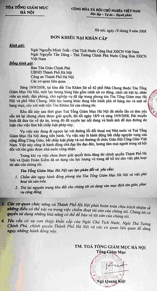 on là Tổng Giám Mục Ngô Quang Kiệt vừa viết thư lên án nhà nước về việc này