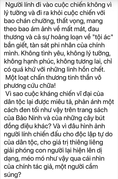 2025-12-06 - Phụng sự Tổ quốc phải là sứ mệnh của văn chương - Điều đó dẫn đến phản ứng của một số cựu chiến binh-những bạn đọc dễ bị tổn thương trước sự “viết lại” lịch sử. Có thể đưa ra một biện giải rằng, đó là yêu cầu “hòa hợp dân tộc” trong bối cảnh mới. Nhưng có nhất thiết phải lấy sự “mờ hóa lịch sử” làm cầu nối “hàn gắn” vết thương chiến tranh?