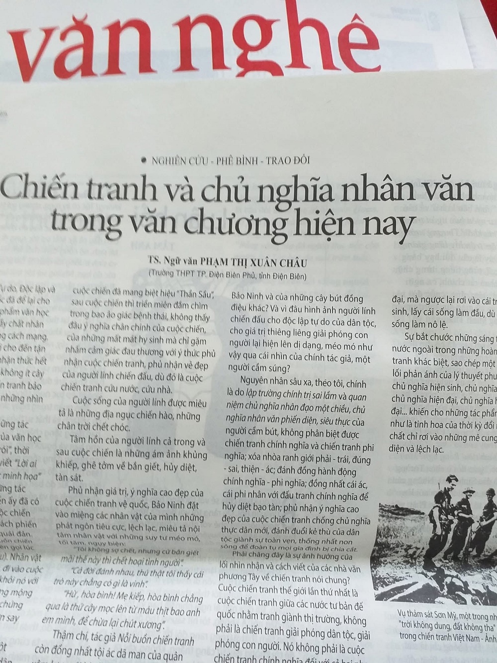 Hôm nay tôi xin trích giới thiệu lại bài “Chiến tranh và chủ nghĩa nhân văn trong văn chương hiện nay” của TS. Phạm Thị Xuân Châu, giáo viên dạy Văn trường PTTH thành phố Điện Biên Phủ, tỉnh Điện Biên cách đây gần chục năm, đăng trên báo Văn Nghệ để thấy rõ đánh giá của một giáo viên về tác phẩm văn học được giảng dạy trong nhà trường…