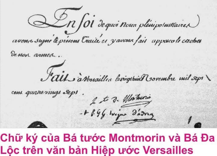 Làm tại Versailles, ngày hai tám tháng mười một năm một ngàn bảy trăm tám bảy (28.11.1787). De Montmorin (đại diện Pháp) Giám mục Adran (đại diện Nguyễn vương)