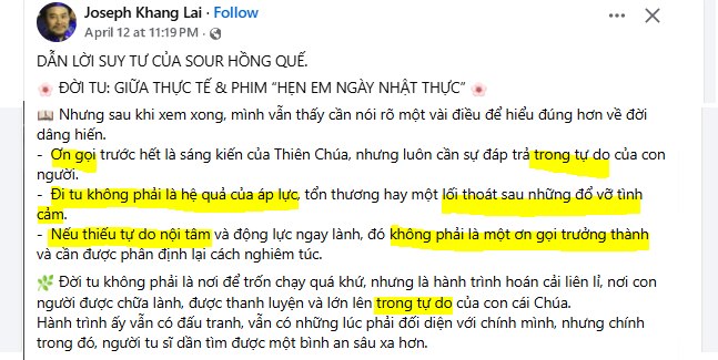 Xin xem phản biện dưới đây. Lý Thái Xuân, April 16, 2026 Những ai có ý nghĩ về "Đi Tu" bên đạo Chúa là "Ơn Gọi", hay "Tận hiến,.." giống như Ma Sơ Hồng Quế dưới đây, xin nghe tôi có ý kiến thế này, xem có đúng không nhé. Nếu tôi nói sai, xin cứ chứng minh ngược lại. 𝟏). 𝐂𝐚́𝐢 𝐦𝐚̀ 𝐜𝐚́𝐜 𝐯𝐢̣ 𝐠𝐨̣𝐢 "𝐎̛𝐧 𝐆𝐨̣𝐢", 𝐤𝐡𝐨̂𝐧𝐠 𝐡𝐞̂̀ 𝐥𝐚̀, 𝐡𝐚𝐲 𝐭𝐫𝐨𝐧𝐠 đ𝐚 𝐬𝐨̂́ 𝐭𝐫𝐮̛𝐨̛̀𝐧𝐠 𝐡𝐨̛̣𝐩, 𝐤𝐡𝐨̂𝐧𝐠 𝐩𝐡𝐚̉𝐢 𝐥𝐚̀ 𝐭𝐮̛̀ 𝐓𝐡𝐢𝐞̂𝐧 𝐂𝐡𝐮́𝐚 𝐧𝐚̀𝐨 𝐜𝐚̉. Thông thường, đó là do ý muốn của cha mẹ muốn "DÂNG CON" của mình cho "Chúa". Xin nhắc lại, thông thường là như thế. -*- Trước nhất, cha mẹ bị ảnh hưởng các câu chuyện trong thánh kinh. Ngày xưa dân Do Thái thường giết cừu đốt để dâng hương vị mỡ cừu cháy trong thịt nướng cho vị Thần của họ gọi là Da-hô-vê. Đó là việc "hiến tế" bình thường. Nhưng rồi, cái tập đoàn cai trị muốn cho dân của họ VÂNG LỜI tuyệt đối, đã viết ra câu chuyện ông ABRAHAM vâng lời Chúa tuyệt đối đến nỗi đem thằng con duy nhất ra, cột chân tay nó để lên đống củi đốt thay cho con cừu đê VUI LÒNG CHÚA. Một câu chuyện hết sức ngu ngốc và tàn bạo dã man đó đã được thánh hóa thành ĐỨC VÂNG LỜI. Kinh nghiệm này đến từ trong gia đình tôi. Bố tôi là một người hết sức bị quyến rũ bới những chuyện kể trong "sách thánh", và đã "dâng người con gái đầu lòng của ông cho "Chúa". Ở tuổi 13, chị tôi chỉ vâng lời thôi. Chị tôi học rất giỏi, nhưng khi đi vào dòng tu thì chỉ có thể học bên trong dòng thôi. Đến năm đệ tứ, năm người ta phải thi bằng Trung Học Đệ Nhất Cấp, hồi đó là bằng cấp căn bản bảo đảm cho một người gọi là "có đủ trình độ" để làm việc văn phòng. Chị tôi muốn thử sức mình có thể đậu được văn bằng đó hay không nên xin bá Mẹ Bề Trên để được thi ở ngoài. Các bạn đoán xem, bà Mẹ bề trên có cho hay không? Đương nhiên là không, vì bà sợ rằng nếu chị tôi được cái bảo đảm tương lai sáng ngời đó sẽ không thèm "dâng hiến" cho Chúa nữa. Sau mấy năm chịu khổ trong nhà dòng, làm việc như những đấy tớ, bị la lối mắng nhiếc.... tất cả các nhục nhằn ấy đều được dạy là "HẦU VIỆC CHÚA!" Lúc thấy được một chút ánh sáng hy vọng thì lại bị chặn ngang. Thế là chị nói với mẹ tôi sự tức tối ấy, và đòi "xuất dòng," chỉ để được đi thi. Mẹ tôi là đạo theo, nhưng sự "cuồng tín" còn hơn cả bố tôi. Dĩ nhiên là mẹ tôi cấm chị tôi nói ra điều ao ước đó, sợ bố tôi giận. Các bạn nghĩ xem. Chị tôi không ở tuổi thất tình với ai cả. Đối với người trong giáo hội, chị tôi là một gương sáng, trong sạch, lý tưởng... đủ thứ, nhưng thực tế thì đó chỉ là kết quả của một hệ thống nhồi sọ, một uy lực mềm, mà ngày nay tôi cho là sự thống trị của những bạo chúa lạc hậu nhất trần gian. -*- Thứ đến, ở các nơi mà đạo Chúa đã thống trị thế quyền rồi, giới giáo sĩ, giới được gọi là "người Chúa chọn", làm mưa làm gió, quyền thế ở đỉnh cao nhất, ai cũng phải phủ phục dưới quyền uy của họ. Từ đó, cha mẹ nào cũng muốn con mình lớn lên sẽ được thiên hạ khoanh tay cúi lạy và vâng lời như thế. Và rồi, cha mẹ sẽ mong được "dâng" con cái mình cho nhà Chúa để gọi là phụng sự cho Chúa. Cuộc đời trong các nhà dòng, chủng viện, được gọi là "sống đời tận hiến", thực ra là do sự thèm muốn cái địa vị được mọi người nể nang đó, chứ không có gì khác. Mà nếu "người con" được người ta nể trọng thì "cha mẹ" của các ÔNG CHA, BÀ PHƯỚC đó cũng càng được nể trọng theo!! Có phải không, thưa quí bạn? Xét kỹ lòng mình đi, đừng ngoa ngôn nữa! 2). Ma sơ Hồng Quế nói rằng "𝑁𝑒̂́𝑢 𝑡ℎ𝑖𝑒̂́𝑢 𝑡𝑢̛̣ 𝑑𝑜 𝑛𝑜̣̂𝑖 𝑡𝑎̂𝑚 𝑣𝑎̀ đ𝑜̣̂𝑛𝑔 𝑙𝑢̛̣𝑐 𝑛𝑔𝑎𝑦 𝑙𝑎̀𝑛ℎ, đ𝑜́ 𝑘ℎ𝑜̂𝑛𝑔 𝑝ℎ𝑎̉𝑖 𝑙𝑎̀ 𝑚𝑜̣̂𝑡 𝑜̛𝑛 𝑔𝑜̣𝑖 𝑡𝑟𝑢̛𝑜̛̉𝑛𝑔 𝑡ℎ𝑎̀𝑛ℎ." Trên thực tế, hầu hết hết các trường hợp "đi tu" bên CGLM đều là "thiếu tự do nội tâm" của nhân vật chính cả. 𝐍𝐡𝐮̛̃𝐧𝐠 đ𝐮̛́𝐚 𝐭𝐫𝐞̉ "đ𝐢 𝐭𝐮" 𝐭𝐫𝐨𝐧𝐠 đ𝐨̣̂ 𝐭𝐮𝐨̂̉𝐢 𝟏𝟐, 𝟏𝟑 𝐥𝐚̀𝐦 𝐠𝐢̀ 𝐜𝐨́ 𝐭𝐮̛̣ 𝐝𝐨 𝐧𝐨̣̂𝐢 𝐭𝐚̂𝐦? 𝐂𝐨̀𝐧 "đ𝐨̣̂𝐧𝐠 𝐥𝐮̛̣𝐜 𝐧𝐠𝐚𝐲 𝐥𝐚̀𝐧𝐡" 𝐥𝐚̀ 𝐯𝐚̂𝐧𝐠 𝐥𝐨̛̀𝐢 𝐜𝐡𝐚 𝐦𝐞̣ 𝐮̛? Nếu chúng không bị huyễn hoặc u mê bằng những từ ngữ "dâng hiến cho Chúa" mà không bị CÁM DỖ bằng những hình ảnh thiên hạ sẽ gọi bằng Cha, bằng Me, bằng Ma Sơ với sự kính trọng tuyệt đối, vô điều kiện như thế, LIỆU CÓ ĐƯỢC bao nhiêu trường hợp??? Ai có thể tự xưng rằng có thể xác lập được nhưng con số trung thực???? Một nhà văn, linh mục tu xuất, 
