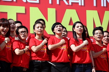 Dưới cái nắng như đổ lửa của Sài Gòn những chiều cuối tháng 5, gần 100 nghệ sĩ cùng hơn 1.000 sinh viên vẫn xếp hàng ngay ngắn, khoác trên mình chiếc áo đỏ thắm màu cờ Tổ quốc để hòa giọng trong ca khúc Những trái tim Việt Nam. Nắng nóng nhưng không thể đội nón hay khoác áo, lại phải tập dợt, quay đi quay lại nhiều lần nhưng dường như ai ai cũng hừng hực một tinh thần hướng về quê hương, đất nước.
