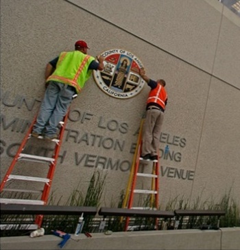 - Các nhân công đang thay con dấu trên một công sự của Quận Los Angeles