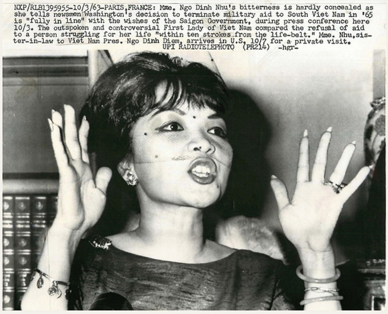 Hình chụp Bà Ngô Đình Nhu tại cuộc họp báo ở Paris ngày 3-10-1963: Bà Ngô Đình Nhu đã không che dấu nỗi cay đắng với nhóm ký giả về quyết định của Washington chấm dứt quân viện cho Nam Việt Nam vào năm ‘65 thì “hoàn toàn phù hợp” với mong muốn của Chính phủ Sài Gòn … (Mme Nhu’s bitterness is hardly concealed as she tells newsmen Washington’s decision to terminate military aid to South Vietnam in 1965 is “fully in line” with the wishes of Saigon Government …) - Ảnh của UPI
