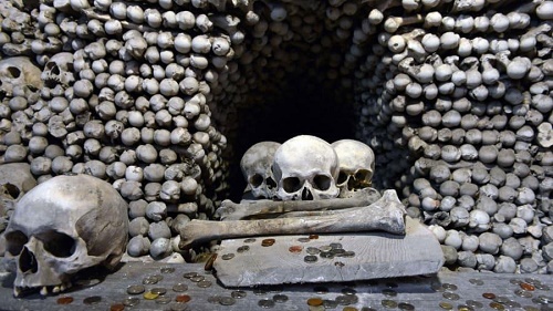 Chuyện bắt đầu vào thế kỷ 13 khi một thầy tu đem về nhà dòng một ít đất được lấy từ nơi mộ của Chúa Kitô. Đó là lý do cho nơi đó sớm trở nên nổi tiếng khắp châu Âu để người ta chọn làm nơi an nghỉ cuối cùng. Chẳng bao lâu, hầm mộ đó đã sắp vỡ trận khi gia tộc Schwarzenberg đã mua nó vào thế kỷ 19. Kế đó họ đã thuê một thợ chạm để thực hiện một thiết kế trang hoàng kỳ lạ nhất chưa từng có, nhái theo huy hiệu độc nhất cho gia đình.