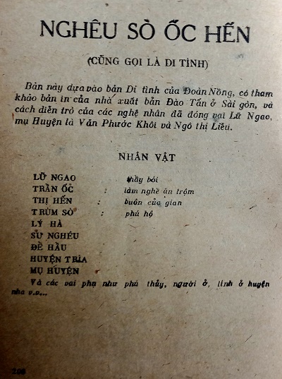 Trước hết, câu chuyện “Ngao Sò Ốc hến” không phải là chuyện cổ tích, mà đó chỉ là câu chuyện dân gian trong nghệ thuật tuồng, thuộc thể loại “tuồng đồ” mang chất hài hước vui vẻ. Loại tuồng sản sinh, sáng tác không phải của nước ngoài (Hát Bội) của Việt Nam, giống như chuyện Quan Âm Thị Kính vậy. Câu chuyện xuất phát từ giới bình dân trong chốn dân gian và được chính nơi sản sinh ra nó nuôi giữ cho đến khi phát triển thành tuồng hát kinh điển của nghệ thuật tuồng. “Ngao Sò Ốc hến” còn có tên gọi khác là “Di Tình”, được nhà nghiên cứu Hoàng Châu Ký (1921 – 2008) sưu tầm. Trong một số vở thể lọai tuồng hài có vở này từ bản gốc Di Tình của Đoàn Nồng, có tham khảo bản in của nhà xuất bản Đào Tấn ở Sài gòn, đây là bản tương đối xưa nhất , và có kết hợp từ cách diễn trò của các nghệ nhân đóng vai Lữ Ngao, Mụ Huyện do văn Phước Khôi và Ngô Thị Liễu thủ diễn. Qua bản này (ảnh 2), chúng ta thấy tất cả chín nhân vật , trong đó có thầy Bói Lữ Ngao và Sư Nghiêu.