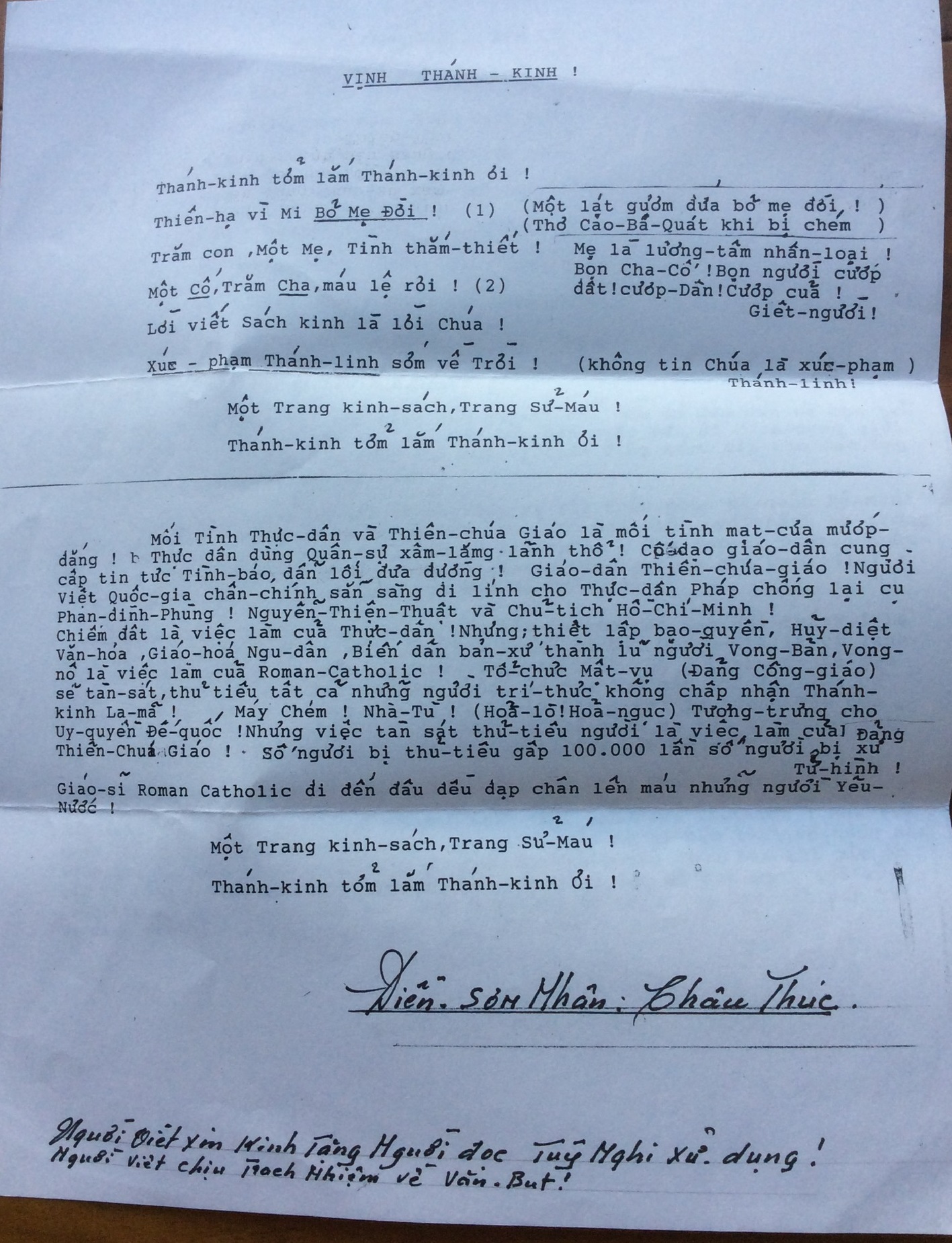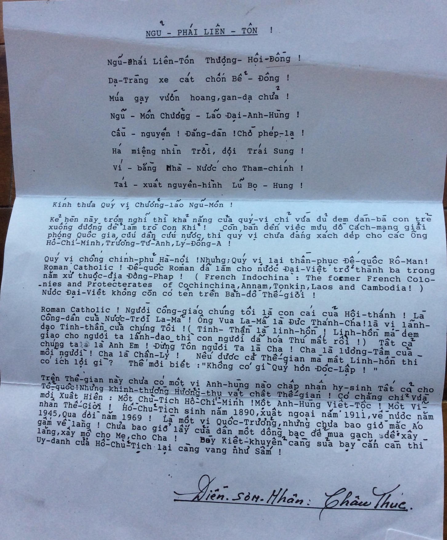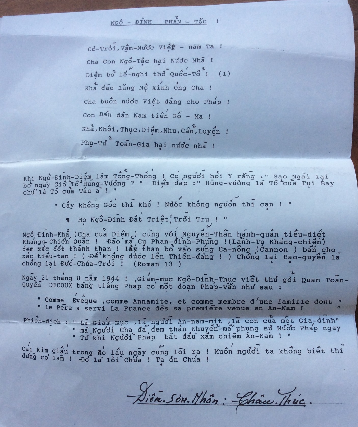 LTS: Trở về sau chuyến nghỉ hè 2 tháng, xin mến chào các bạn đọc. Bất ngờ bắt gặp một bao thơ có 3 trang giấy này gửi cho tòa soạn từ rất lâu đến độ không còn nhớ lúc nào nữa. Ba trang này rất thích hợp để trình làng hôm nay, ngày mà "hậu duệ hệ lụy" của cố Tổng Thống VNCH I, Ngô Đình Diệm, đang làm mọi cách để tưởng nhớ ông ta trong hy vọng vực dậy xác chết của một chế độ tay sai Mỹ.