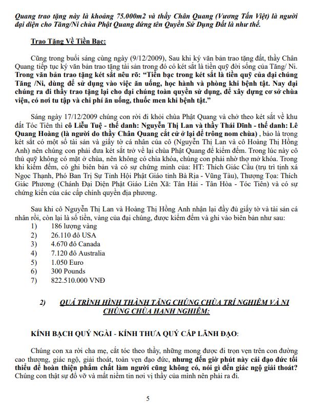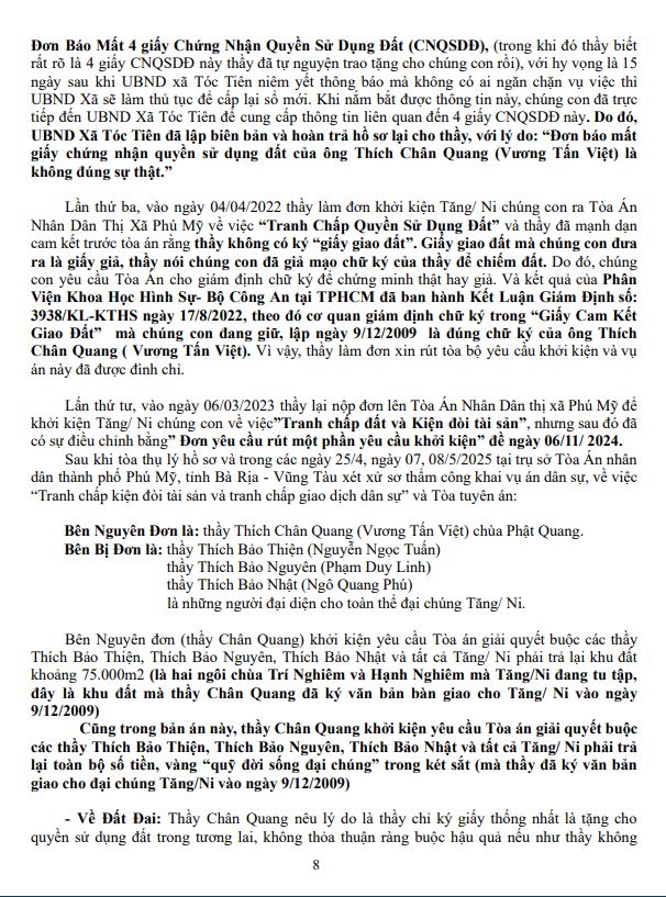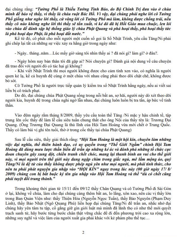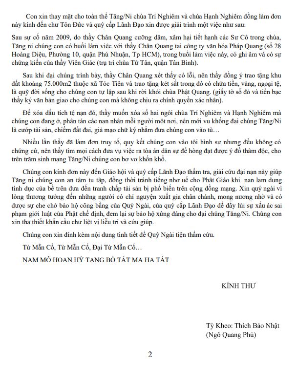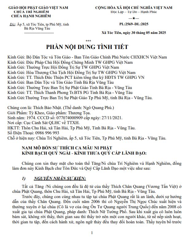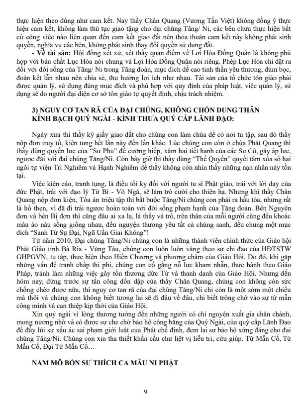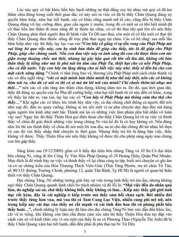 LTS: Tòa soạn chúng tôi nhận được một tài liệu gọi là bức tâm thư dưới đây từ một trong những người được xem là nạn nhân của một số sinh hoạt của sư Thích Chân Quang, và lời yêu cầu tha thiết được phổ biến. Mong và chúc nạn nhân sớm có được phản hồi từ những cơ quan trách nhiệm. (SH)
