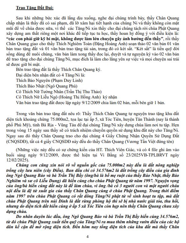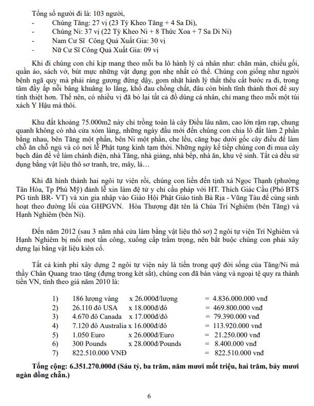 Văn bản số 290/TB.CAT(PV24) ngày 08/11/2010 của Công an tỉnh Bà Rịa – Vũng Tàu (cũ) từng xác định: “Số tài sản mà nhóm tu sĩ mang đi là tài sản chung của chùa do bá tánh đóng góp… các tu sĩ đều là thành viên của chùa…”