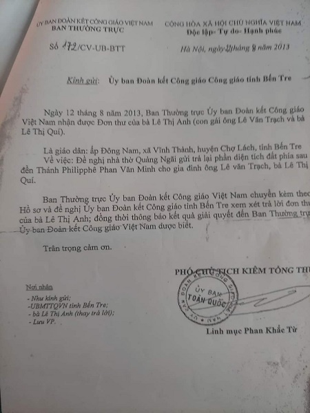 Trước đây, do thiếu hiểu biết, tôi không biết tất cả tài sản của giáo hội trong giáo phận đều do đức giám mục quản lý, vì vậy việc nhà thờ Quảng Ngãi lấy đất của gia đình tôi để làm giấy chứng nhận quyền sử dụng đất cho nhà thờ là thuộc trách nhiệm của giám mục, cụ thể là giám mục Huỳnh văn Hai. Chúng tôi sẽ không làm việc với ai trừ khi người đó có giấy ủy quyền theo đúng quy định pháp luật từ ông Huỳnh văn Hai