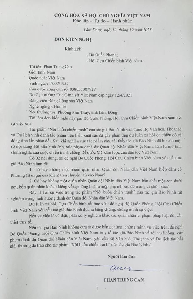 ● 2025-12-12 - Đơn Kiến Nghị Thu Hồi Tác Phẩm Nỗi Buồn Chiến Tranh - Phan Trung Can -