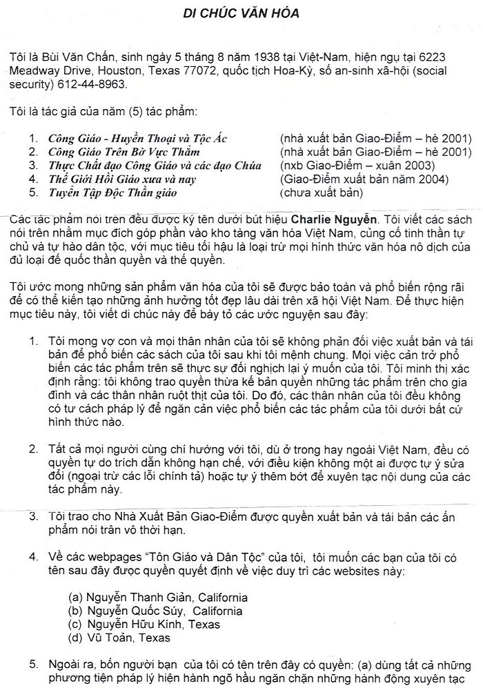 DI CHÚC VĂN HÓA Tôi là Bùi Văn Chấn, sanh ngày 5 tháng 8 năm 1938, hiện ngụ tại 6223 Meadway Drive, Houston, Texas 77072, quốc tịch Hoa Kỳ, số an sinh Xã hội ( social security ) 612 – 44 – 8963. Tôi là tác giả của năm (5) tác phẩm: 1- Công Giáo – Huyền Thoại Và Tội Ác ( nhà xuất bản Giao Điểm – hè 2001 ) 2- Công Giáo Trên Bờ Vực Thẳm ( nhà xuất bản Giao Điểm – hè 2001 ) 3- Thực Chất Đạo Công Giáo Và Các Đạo Chúa ( nxb Giao Điểm – xuân 2003 ) 4- Thế Giới Hồi Giáo Xưa Và Nay ( Giao Điểm xuất bản năm 2004 ) 5- Tuyển Tập Độc Thần Giáo ( chưa xuất bản ) Các tác phẩm nói trên đều được ký bút hiệu Charlie Nguyễn Tôi viết các sách nói trên nhằm mục đích góp phần cho kho tàng văn hóa Việt Nam, cũng cố tinh thần tự chủ và tự hào dân tộc, với mục tiêu tối hậu là loại trừ mọi hình thức văn hóa nô dịch của đủ loại đế quốc thần quyền và thế quyền. Tôi ước mong những tác phẩm văn hóa của tôi sẽ được bảo toàn và phổ biến rông rãi để có thể kiến tạo những ảnh hưởng tốt đẹp lâu dài trên xã hội Việt Nam. Để thực hiện mục tiêu này, tôi viết di chúc này để bày tỏ các ước nguyện sau đây: 1- Tôi mong vợ con và mọi thân nhân của tôi sẽ không phản đối việc xuất bản và tái bản để phổ biến các sách của tôi sau khi tôi mệnh chung. Mọi việc cản trở phổ biến các tác phẩm trên sẽ thực sự đối nghịch lại ý muốn của tôi. Tôi minh thị xác định rằng tôi không trao quyền thừa kế bản quyền những tác phẩm trên cho gia đình và các thân nhân ruột thịt của tôi. Do đó, các thân nhân của tôi đều không có tư cách pháp lý để ngăn cản việc phổ biến các tác phẩm của tôi dưới bất cứ hình thức nào 2- Tất cả mọi người cùng chí hướng với tôi, dù ở trong hay ngoài Việt Nam, đều có quyền tự do trích dẫn không hạn chế, với điều kiện không một ai được tự ý sữa đổi ( ngoại trừ các lỗi chính tả) hoặc tự ý thêm bớt để xuyên tạc nội dung của các tác phẩm này. 3- Tôi trao cho Nhà Xuất Bản Giao Điểm được quyền xuất bản và tái bản các ấn phẩm nói trên vô thời hạn 4- Về các webpages “ Tôn Giáo và Dân Tộc “ của tôi, tôi muốn các bạn của tôi có tên sau đây được quyền quyết định về việc duy trì các websites này: (a) Nguyễn Thanh Giản, California (b) Nguyễn Quốc Súy, California (c) Nguyễn Hữu Kính, Texas (d) Vũ Toản, Texas 5- Ngoài ra bốn người bạn của tôi có tên trên đây có quyền (a) dùng tất cả những phương tiện pháp lý hiện hành ngõ hầu ngăn chận những hành động xuyên tạc nội dung các tác phẩm và bài viết của tôi, (b) thông báo cho thân nhân của tôi biết nội dung Di Chúc Văn Hóa này. Trong trường hợp gia đình tôi ngăn chận việc phổ biến các tác phẩm nói trên để ý nguyện của tôi được chấp hành. Bản Di Chúc này thay thế Di Chúc Văn Hóa của tôi làm tại Van Nuys, California ngày 03-01-2002 và bản Di Chúc Văn Hóa của tôi làm tại Houston ngày 05-05-2003. Tôi viết tờ Di Chúc này trong tình trạng tinh thần sáng suốt và hoàn toàn không bị chi phối bất cứ một áp lực nào. Bản Di Chúc này được xác nhận bởi hai nhân chứng. 1- Nguyễn Anh Tuấn, 8507 Cook Glass Drive, Houston, Texas 77072 2- Lữ Tấn Hồng, 8410 Leamont, Houston, Texas 77072 Làm tại Houston, ngày 7 tháng 7 năm Hai Ngàn Lẻ Bốn ( 2004 ) Ký tên: _____ ký Bùi Văn Chấn______________ Bùi Văn Chấn, bút hiệu Charlie Nguyễn