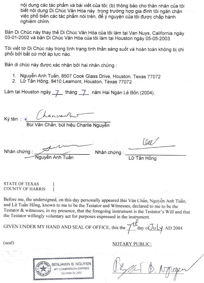 STATE OF TEXAS COUNTY OF HARRIS Before me, the undersigned, on this day personally appeared Bùi Văn Chấn, Nguyễn Anh Tuấn and Lê Tấn Hồng, known to be to me the Testator and Witnesses, declared to me to be the Testator & Witnesses, in my presence, that the foregoing instrument is the Testator’s Will and that the Testator willingly voluntary act for purposes expressed in the instrument. GIVE ME UNDER MY HAND AND SEAL OF OFFICE, this the 7th day of July AD 2004 ( Seal ) NOTARY PUBLIC: BENJAMIN B. NGUYEN ký Benjamin B. Nguyen My Commission expires December 23,2007