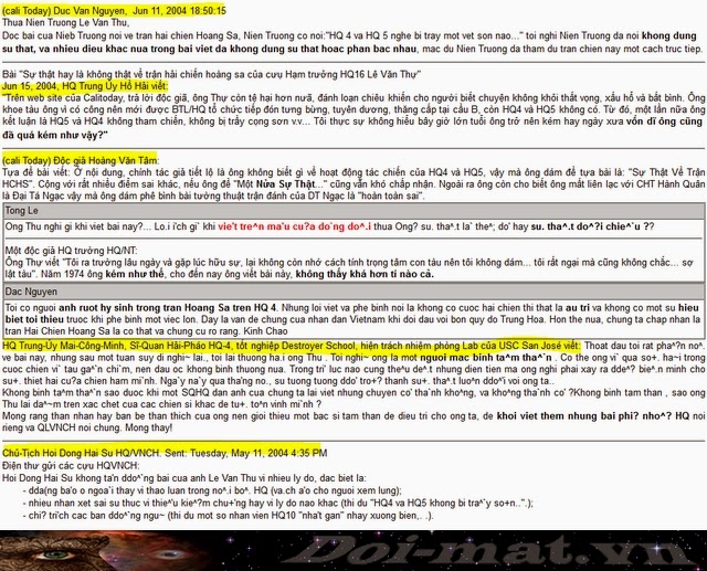 -- oo0oo -- Calitoday, 1/6/04 Lê Văn Thự Kính qúi độc giả, Sau khi bài viết "Sự thật về trận hải chiến Hoàng Sa" của tôi được đưa lên website Calitoday, nhiều độc giả góp ý trên mạng này, trong đó đồng ý cũng có mà chỉ trích cũng có. Tôi nghĩ đó là chuyện thường tình, nhưng tôi cũng xin phép được trả lời một vài độc giả đã buộc tội tôi, trong số này có cựu Hải Quân Thiếu Tá Nguyễn Chí Toàn là người trong cuộc - ông Toàn có mặt trên HQ5 là chiến hạm đã dự trận Hoàng Sa - và ông Hoàng văn Tâm mà tôi chắc cũng là một cựu HQ tuy ông không nói ra. Những ý kiến của hai ông này nếu tôi không trả lời thì có thể gây ảnh hưởng sai lạc hay tạo nghi vấn nơi độc giả khi đọc bài viết cuả tôi. Trước khi trả lời thẳng vào những điểm ông Toàn và ông Tâm chỉ trích tôi, tôi xin nói rộng ra một chút về những gì liên quan đến trận chiến Hoàng Sa để quí độc giả hiểu rõ vấn đề hơn. (SH: Những lời phản hồi sau đây do trang nhà https://www.doi-mat.vn/ chụp lại) 1. Trận hải chiến Hoàng Sa xảy ra cách đây 30 năm ở giữa biển khơi nên không ai có thể biết để kiểm chứng những gì tôi hay các người khác có dự trận hải chiến Hoàng Sa viết ra, ngoại trừ những người trong cuộc. Nhưng những người trong cuộc một số hoặc vì không đủ điều kiện hoặc vì ngại ngùng không muốn lên tiếng để nói lên sự thật, một số khác thì vì lý do này hay lý do khác lại muốn che dấu sự thật bằng cách nói khác đi, do đó nếu độc giả chỉ đọc một vài ý kiến nêu lên trong mục góp ý của mạng này thì khó mà biết đâu là sự thật. Muốn biết rõ về trận hải chiến Hoàng Sa phải tìm đọc tất cả các bài viết liên hệ rồi phân tích, so sánh mới may ra thấy được đâu là sự thật. Chưa kể là phải sưu tầm thêm tài liệu của Bộ Tư Lệnh Hải Quân VN Cộng Hòa (BTL/HQ/VNCH) cũng như từ phía Trung Cộng có liên quan đến trận hải chiến Hoàng Sa. Công việc này đòi hỏi chuyên môn và chỉ dành cho những nhà nghiên cứu. Trận hải chiến Hoàng Sa năm 1974 tôi nghĩ là một thất bại trước mắt mọi người trong nước lúc đó (trong cũng như ngoài Hải Quân) vì đã không giữ được đảo Hoàng Sa, chứ không phải là một chiến thắng như một số người trong Hải Quân đang huênh hoang lúc này ở hải ngoại. Dân chúng Miền Nam thì rộng lượng chấp nhận thất bại vì cho rằng VN Cộng Hòa qúa yếu so vơí Trung Quốc nên dư luận qua báo chí thời đó không hề chỉ trích hay lên án Hải Quân VN đã để mất Hoàng Sa, còn trong nội bộ Hải Quân tôi đoán đa số cảm thấy không có gì để hãnh diện, không thỏa mãn và nghi ngờ tinh thần chiến đấu của các cấp chỉ huy trong trận chiến Hoàng Sa mặc dầu họ không biết sự thật như thế nào. 2. Tôi xin trích đoạn từ bài viết "Tường Thuật Trận Hải Chiến Hoàng Sa" của Đại Tá Hà văn Ngạc (page 21 of 33) để quí độc giả thấy phản ứng của vị Tư Lệnh Hải Quân VNCH đối với cấp chỉ huy trận chiến Hoàng Sa. Đại Tá Ngạc viết: "Vào khoảng 01:00 giờ trưa (ngày 19/1/74), hai chiến hạm HQ4 và HQ5 đã cách Hoàng Sa chừng 10 hải lý, trời nắng và quang đãng. Tư Lệnh HQ đích thân ra lệnh cho cả hai chiến hạm trở lại Hoàng Sa và đánh chìm nếu cần, tôi nhận được giọng nói của Đô Đốc. Lệnh được thi hành nghiêm chỉnh ngay tức khắc. Sau khi liên lạc vô tuyến siêu tần số được điều hòa trở lại thì mọi báo cáo chi tiết về tổn thất và tình trạng lúc bấy giờ của hai chiến hạm được chuyển đầy đủ. Trên Tuần Dương Hạm HQ5 tôi cũng được thông báo về Tuần Dương Hạm HQ16 được Tuần Dương Hạm HQ6 tới hộ tống về Căn Cứ Hải Quân Đà Nẳng. Đến khoảng 2:30 chiều , khi cả hai chiến hạm đang trở về Hoàng Sa, quá ngang Hòn Tri Tôn, nghĩa là cách đảo Hoàng Sa chừng 1 giờ rưỡi hải hành nữa (tức là cách Hoàng Sa chừng 22 hải lý nếu chạy với vận tốc 15 hải lý/giờ:ghi chú của người viết) thì hai chiến hạm được phản lệnh trở về Đà Nẳng." Tại sao Tư Lệnh Hải Quân(TLHQ) đích thân ra lệnh cho cả hai chiến hạm HQ4 và HQ5 quay trở lại Hoàng Sa? Tôi đoán là TLHQ sau khi nghe Đại Tá Ngạc báo cáo có phản lực cơ và chiến hạm trang bị hỏa tiễn của Trung Cộng xuất hiện để có lý do rút lui, đã không tin những gì Đại Tá Ngạc báo cáo nên mơí bắt Đại Tá Ngạc quay trở lại Hoàng Sa. Nhưng tại sao một giờ rưỡi sau, TLHQ lại ra phản lệnh cho phép Đại Tá Ngạc và HQ4, HQ5 trở về Đà Nẵng? Tôi đoán là vì TLHQ cảm thấy bất lực trước một cấp chỉ huy tỏ ra tiêu cực trong khi thi hành nhiệm vụ ở giữa biển mà ông không thể nào kiểm soát được. Nếu đã sợ mà rút lui thì khi bắt quay trở lại: hoặc Đại Tá Ngạc có thể cho HQ4, HQ5 lềnh bềnh giữa biển mà vẫn báo cáo là đang tiến về Hoàng Sa như trích đoạn bài viết của Đại Tá Ngạc ở trên cho thấy lúc 1:00 giờ cách Hoàng Sa 10 hải lý; lúc 2:30 giờ lại cách Hoàng Sa 22 Hải lý. Như vậy là đi thụt lùi chứ đâu