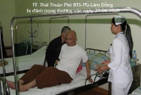 TT Thái Thuận - Phó BTS Phật giáo Lâm Đồng bị đánh trọng thương vào ngày 20-6-2009 Tội của TT Đức Nghi đã quá rõ ràng như thế, được tổ chức cao nhất của Giáo hội PG Lâm Đồng tường trình với Nhà nước, với Chính phủ, với các cơ quan chức năng ở Trung ương và địa phương như thế mà các cơ quan chức năng của nhà nước và GHPG ở Trung ương, suốt trong hơn ba tháng qua chưa hề đả động gì đên TT Đức Nghi và đồng bọn? TT Đức Nghi là ai mà được sống ngoài pháp luật và Giáo luật như thê? Là ai mà được tự do thực hiện luật rừng đối với BTS GHPG Lâm Đồng, với 400 Thiền sinh tu theo Pháp môn Làng Mai chỉ biết tự vệ bằng niệm Phật như thế? 3/ Tất cả các cuộc bạo hành do thầy trò TT Đức Nghi tiến hành ở Tu viện Bát Nhã từ tháng 6 đến nay đều có sự chứng kiến của công an cảnh sát địa phương. Công an cảnh sát là những người có nhiệm vụ trấn áp tội phạm bảo vệ dân lành, tại sao các anh lại không ngừng phối hợp với tội phạm mang tên Thích Đức Nghi ? Hay Thích Đức Nghi là người của ...? 4/ Công an, Cảnh sát là lực lượng thi hành pháp luật, chính đại quang minh, thế lực lượng công an cảnh sát của địa phương đi đâu mà không tham gia vào việc cưỡng chế 400 Thiền sinh ở tu viện Bát Nhã mà lại đi dùng đến những thành phần ô hợp xã hội đen? Hành xử như thế các anh có biết là tiếp tay cho bọn chống phá Việt Nam bôi nhọ chính quyền ta không? 5/ Chuyện phát biểu cúa Sư ông Nhất Hạnh không thuận với Nhà nước VN là chuyện của Sư ông và Nhà nước, việc tu hành của 400 thanh thiếu niên theo Môn phái Làng Mai không có biểu hiện gì liên quan đến sự không thuận ấy, không có bất cứ biểu hiện gì “nguy hại” đến an ninh, chính tri cấp thời ở địa phương cả, thế vì sao tỉnh Lâm Đồng lại tiến hành việc cưỡng chế gấp rút giữa ngày mưa gió lạnh lẽo ảnh hưởng của Bão số 9 như thế ? 6/ Chính quyền Lâm Đồng, TX Bảo Lộc, Công an địa phương qua các phương tiện phát thanh, qua các cuộc phổ biến thời sự ở địa phương, luôn xác định “Việc rắc rối xảy ra ở TV Làng Mai là chuyện nội bộ của Phật giáo”. 400 Thiền sinh tu theo Pháp môn Làng Mai ở TV Bát Nhã là đệ tử của TT Đức Nghi - Phó Ban Trị sự GHPG Lâm Đồng, dù TT Đức Nghi đã bỏ rơi họ, nhưng họ vẫn là một bộ phận của Phật giáo ở Bảo Lộc (Lâm Đồng). Tại sao chính quyền cưỡng chế 400 người xuất gia theo Phật ấy không có mặt bất cứ một đại diện BTS GHPG TX Bảo Lộc hay của tỉnh Lâm Đòng nào cả?