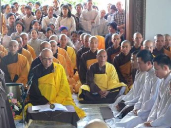 TT Đức Nghi chủ lễ cho 45 giới tử xuất gia ngày 8-1-2006 7/ Khoản 4, trong Bản tường trình ngày 12-8-2008 dài 18 trang, do các các vị Thích Chân Pháp Khâm, Thích Chân Trung Hải, Thích Nữ Chân Thoại Nghiêm, Thích Nữ Chân Phúc Nghiêm viết và gởi lên Ban Trị sự Tỉnh Hội Phật Giáo tỉnh Lâm Đồng, Ban Đại diện Phật giáo Thị Xã Bảo Lộc viêc xây dựng cơ sở ở TV Bát Nhã và tiền mua đất và xây dựng Xóm Mây Đầu Núi bên cạnh Tu viện với tổng số tiền là: 12tỷ 509 triệu+ 2tr800 triệu+ 3tỷ 370 triệu = 18 tỷ 679 triệu (hơn 1 triệu USD). Các cơ sở xây dựng xóm Rừng Phương Bối, xóm Bếp Lửa Hông, xóm Mây Đầu Núi, và Thiền đường Cánh Đại Bàn là tài sản của Tăng thân Làng Mai. Trước khi trục xuất 400 người chủ của các cơ sở ấy ra khỏi nhà của họ, Chính quyền địa phương và TT Đức Nghi đã có phương án xử lý số tài sản hơn 1 triệu USD ấy như thế nào chưa? 8/ Cho thực hiện việc cưỡng chế 400 Thiền sinh ra khỏi Tu viện bát Nhã bằng biện pháp bạo hành dẫn trên, lãnh đạo tỉnh Lâm Đồng hẵn đã hiểu rõ việc làm của mình. Vậy, kính mong các đồng chí giúp cho người cầm bút già nầy được biết (để viết lịch sử) việc bạo hành của những người thừa hành các đồng chí thực hiện ở TV Bát Nhã vừa qua có khác gì với những bạo hành mà chế độ Ngô Đình Diệm thực hiện để đàn áp Phật giáo năm 1963 như thế nào không (về hình thức lẫn nội dung) ? (Nếu không khác thì giới sử học VN phải rất khó khăn khi viết Lịch sử chế độ Diệm. Kính mong các đồng chí hãy cứu giới nghiên cứu chúng tôi). Còn nhiều điều cần phải được giải thích nữa, nhưng bài viết đã quá dài tôi không tiện nêu ra thêm. Nếu được các cấp quan tâm, tôi sẽ nêu tiếp trong những bài sau. Về chế độ thì tôi đã hưu trí trên mười năm, nhưng với trách nhiệm của người cầm bút cách mạng thì tôi vẫn còn đứng vững trên mặt trân văn hóa tư tửong bảo vệ đất nước và dân tộc. Để tôi có thể tiếp tục tự hào về cuộc đời mình đã góp phần xây dựng nên một xã hội “công bằng, dân chủ, văn minh”, để khi cầm bút tôi không bị vướng bận gì, kính mong các cơ quan chức năng ở Trung ương, Lãnh đạo tỉnh Lâm Đồng, Giáo hội Phật giáo Việt Nam giải thích giùm tôi những câu hỏi trên. Nếu không được quý vị quan tâm thì niềm tin về Đảng, về GHPG VN ở cuối đời của tôi sẽ giả từ tôi. Rất kính mong. Gác Thọ Lộc, tháng 10-2009.