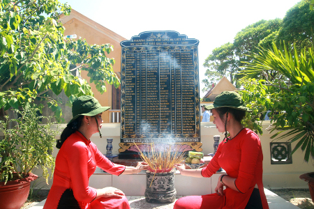 Thả hoa tưởng niệm các liệt sĩ đã hy sinh tại quần đảo Trường Sa - Ảnh: VĂN DŨNG Đoàn đã dâng hương, thả vòng hoa rồi từng người lần lượt thả từng cành hoa tưởng niệm xuống biển. Hoa như máu thắm của các anh ngày nào đã quyện đỏ lòng son cùng biển đảo đất nước. Ngày 14/3/1988, trên vùng biển đảo Gạc Ma đã diễn ra trận chiến ác liệt, không cân sức giữa một bên là những cán bộ, chiến sĩ hải quân Việt Nam đang làm nhiệm vụ xây dựng đảo, trong tay chỉ có cuốc, xẻng, xà beng và súng bộ binh với quân Trung Quốc gồm những tàu chiến hiện đại, vũ khí tối tân. Trước sự hung bạo của địch, nhiều tấm gương mưu trí, quả cảm, kiên cường của quân ta đã xuất hiện. Dâng hương tưởng niệm trước bia ghi danh 64 liệt sĩ đã hy sinh tại đảo Gạc Ma, quần đảo Trường Sa ngày 14/3/1988 (bia đặt trong khuôn viên chùa đảo Sinh Tồn, quần đảo Trường Sa) - Ảnh: V.D Đó là Trung tá Trần Đức Thông, Phó Lữ đoàn trưởng Lữ đoàn 146, Đại úy Vũ Phi Trừ, Thuyền trưởng tàu HQ-604 đã bình tĩnh chỉ huy các chiến sĩ kiên cường chiến đấu, sẵn sàng xả thân vì chủ quyền biển đảo Tổ quốc. Đó là Thiếu úy Trần Văn Phương, Phó Chỉ huy trưởng đảo Gạc Ma trước lúc hy sinh đã quấn cờ Tổ quốc quanh thân mình và động viên đồng đội: “Không được lùi bước. Phải để cho máu mình tô thắm lá cờ Tổ quốc và truyền thống vinh quang của Quân chủng”. Đó là anh hùng Nguyễn Văn Lanh bị thương nặng vẫn không rời vị trí chiến đấu, quyết giữ đảo đến cùng. Đó là Thiếu tá Thuyền trưởng Vũ Huy Lễ, chỉ huy tàu HQ-505 đã có một quyết định táo bạo, mưu trí, sáng suốt. Lúc đó, tàu HQ-505 bị quân Trung Quốc bắn hỏng máy, trôi ra xa đảo Cô Lin (đảo Cô Lin cách không xa đảo Gạc Ma) và có nguy cơ bị chìm. Nếu tàu HQ-505 không nhanh chóng trở lại với đảo Cô Lin, tàu sẽ chìm, các chiến sĩ trên tàu sẽ hy sinh và đảo Cô Lin sẽ bị địch chiếm mất. Trước tình thế nguy kịch, ngàn cân treo sợi tóc, Thiếu tá Thuyền trưởng Vũ Huy Lễ đã chỉ huy tàu HQ-505 vừa đánh trả địch, vừa tiến về phía đảo Cô Lin, rồi nhanh chóng cho tàu lao lên bãi ngầm đảo này, biến con tàu thành pháo đài vững chắc để giữ đảo Cô Lin. Do lập nên chiến công tuyệt vời này, Thiếu tá Thuyền trưởng Vũ Huy Lễ đã được Nhà nước trao tặng danh hiệu Anh hùng lực lượng vũ trang nhân dân. Trong số 64 liệt sĩ đã ngã xuống tại vùng biển đảo Gạc Ma, có 2 liệt sĩ ở Quảng Trị. Trong số 2 liệt sĩ ở Quảng Trị, liệt sĩ Tống Sỹ Bái là chú ruột của Tống Văn Cường, nhân viên Trung tâm Công nghệ Thông tin và Truyền thông Quảng Trị, đơn vị sự nghiệp trực thuộc Sở Thông tin và Truyền thông Quảng Trị, nơi tôi công tác. Sau “khúc tưởng niệm trên biển” cùng với đoàn, khi trở về đất liền, nhờ Cường, tôi đã có riêng “khúc tưởng niệm liệt sĩ Tống Sỹ Bái”. Mộ liệt sĩ Tống Sỹ Bái (hy sinh tại vùng biển đảo Gạc Ma, chưa tìm được hài cốt) ở Cam An, Cam Lộ (phía sau là mộ thân phụ của liệt sĩ) - Ảnh: N.H Cường dẫn tôi đi thăm mộ liệt sĩ Tống Sỹ Bái đặt trên đất làng Phổ Lại Phường, Cam An, Cam Lộ, Quảng Trị. Anh Bái ngã xuống khi chỉ mới 21 tuổi. Mộ anh đặt cạnh mộ của người cha và mộ của những người thân. Anh đã hiến thân mình cho đảo Gạc Ma nên mộ anh không có thi hài mà chỉ có hình nhân được táng vào đó, thay cho anh. Viếng mộ anh Bái về, tôi đến thăm gia đình bố mẹ Cường, bà nội Cường (tức mẹ của anh Bái). Anh Tống Sỹ Kỳ, 63 tuổi, bố Cường, bùi ngùi kể: “Năm 1988, gia đình nhận được giấy báo tử, nhưng phải 5 năm sau, gia đình mới dựng mộ cho chú Bái, do có người nói chú chưa mất hoặc chú đang bị Trung Quốc bắt. Năm 1993, gia đình mới mời thầy pháp về để luyện cốt, chiêu hồn cho chú. Cốt là hình nhân, lấy sọ dừa làm đầu, lấy sáp làm thân, lấy cây dâu làm đốt xương, lấy máu từng người trong nhà giọt vào cây dâu, táng vào tiểu ván. Áo quần của chú còn lại cho vào trong tiểu luôn”. Bà Hoàng Thị Giỏ, 85 tuổi, người đã chịu đựng nỗi đau tột cùng mất con, mất cả hình hài con, nghẹn ngào nhớ lại buổi anh Bái lên đường tòng quân: “Hắn nói mạ để cho con đi. Trước sau, con cũng đi nghĩa vụ. Lúc đó, tên hắn chưa đến lượt gọi đi”. Anh Kỳ nhớ như in về dáng vóc, tâm tính đứa em liệt sĩ: “Chú Bái người cao, đẹp trai. Tính tình dễ thương, không làm mất lòng ai. Trước khi vào hải quân, chú đã có người yêu. Chú nói, em đi nghĩa vụ đợt này về rồi tính chuyện vợ con”. Anh Kỳ kể thêm rằng, cách đây ba năm, bên quân đội đã cử người đến lấy mẫu máu của anh Kỳ, mẹ anh Kỳ và một người em gái anh Kỳ để đối chiếu với những mẫu hài cốt liệt sĩ đã tìm được. Sau đó, anh được báo tin mẫu máu của anh và những người thân trong gia đình anh không khớp với mẫu hài cốt nào cả. Ôi! Gạc Ma đau thương, Gạc Ma bi hùng, Gạc