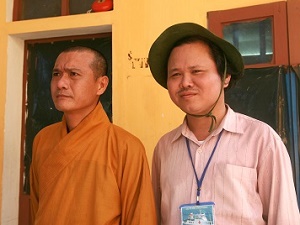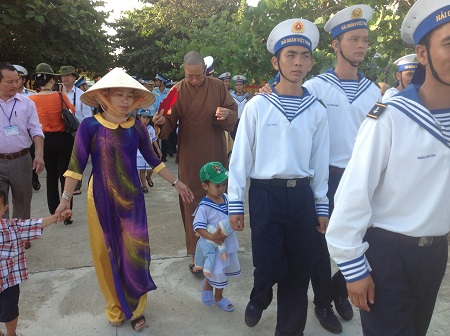 Tác giả bài viết với Đại đức Thích Minh Huy, trụ trì chùa đảo Sinh Tồn. Ảnh của VĂN DŨNG Nhân thầy Thích Giác Nghĩa ra trụ trì ở chùa Trường Sa, thầy Thích Tâm Trí ở chùa An Dưỡng, tỉnh Khánh Hòa đã làm thơ tiễn. Bài thơ với từng câu không dài, chỉ một, hai, ba chữ, chắc nịch, ngắn gọn, như lời niệm câu thần chú, như lệnh truyền từ tâm qua tâm, chất chứa bao niềm thiết tha, gửi gắm, niềm thúc giục lên đường vì sứ mệnh thiêng liêng: Đi Đi Đi Đi Chùa Trường Sa luôn gắn liền với mạch nguồn truyền thống, với linh khí của đất nước đã hun đúc và trao truyền. Năm 2013, thầy Thích Giác Nghĩa đã rước tượng Phật hoàng Trần Nhân Tông ra thờ ở chùa này. Năm 2014, gia đình Đại tướng Võ Nguyên Giáp đã trao di ảnh Đại tướng cho chùa để thờ. Sau khi thầy Thích Giác Nghĩa thôi trụ trì ở chùa Trường Sa, đại đức Thích Pháp Đạt, Ủy viên Ban Hoằng pháp, Giáo hội Phật giáo Việt Nam tỉnh Khánh Hòa đã đến trụ trì ở chùa này. Cùng với thầy Đạt, còn có đại đức Thích Như Đạo, phó trụ trì. Một sớm thong thả, thư thái, tôi ngồi đàm đạo việc đời, việc đạo với đại đức Thích Pháp Đạt bên chén trà tỏa hương ngào ngạt, trong sân chùa Trường Sa, dưới tán cây rợp mát. Đại đức tâm sự: - So với đất liền, ở đây thiếu thốn nhiều thứ. Nhưng chúng tôi khắc phục khó khăn. Tùy duyên mà làm việc. Hai anh em chúng tôi ra đây là phát nguyện đi vùng sâu, vùng xa. Nơi nào cần, nơi nào khó khăn, mình đến. Sau này, mình đến với những nơi khác sẽ cảm thấy dễ hơn. Khó khăn lớn vượt qua được thì những khó khăn khác cũng sẽ nhẹ nhàng hơn. Đại đức Thích Pháp Đạt quê ở Phan Thiết, từng tu học ở thành phố Hồ Chí Minh, hành đạo ở Nha Trang, Khánh Hòa. Theo đại đức cho biết, đại đức có hướng sẽ ra tu ở miền Bắc, sau này. Nhân chuyện thầy Nghĩa rước tượng Phật hoàng Trần Nhân Tông ra thờ ở chùa Trường Sa, chuyện thầy Đạt dự định mai kia sẽ ra đất Bắc, tôi và thầy Đạt cùng nhớ về truyền thống giúp đời, góp phần dựng nước của Phật giáo Việt Nam nói chung, Phật giáo thời Trần nói riêng, nhớ về công lao to lớn của vua Trần Nhân Tông, người đã lãnh đạo cuộc kháng chiến chống Nguyên Mông lần thứ hai và thứ ba thắng lợi, cũng là vị Phật hoàng đã lập ra dòng thiền Trúc Lâm Yên Tử. Thầy Đạt như thăng hoa trong dòng mạch cảm khái, giọng tha thiết: - Yêu nước là niềm tự hào của người con Phật. Đạo pháp luôn đi cùng dân tộc, đồng hành cùng dân tộc. Mỗi sáng, mỗi chiều và khi đêm xuống, tôi nghe tiếng chuông chùa Trường Sa ngân nga, thao thức, đồng vọng cùng tâm nguyện của quân dân Trường Sa một lòng son sắt với Tổ quốc, gìn giữ hòa bình, bảo vệ vững chắc chủ quyền biển đảo thiêng liêng. Một trong những biểu hiện đặc biệt, đầy cảm động của tâm nguyện đó thể hiện qua nghĩa cử cao đẹp của ông Hoàng Văn Sáu, quê ở làng Nam Thượng, xã Tây Hồ, huyện Thọ Xuân, tỉnh Thanh Hóa, trú tại quận Bình Thạnh, thành phố Hồ Chí Minh. Ông Sáu đã cung tiến xây dựng trên đảo Trường Sa công trình Đài tưởng niệm các anh hùng liệt sĩ, với tổng số tiền là 9.986.681.000 đồng, khánh thành ngày 28/6/2010. Đài xây hình tháp thanh thoát, vút cao trên nền trời hòa bình xanh ngắt của đảo Trường Sa. Ở bên ngoài khuôn viên, phía trước Đài tưởng niệm, một tượng Phật Quan Âm được dựng lên để chung niềm sẻ chia, thấu tỏ và đồng vọng với cõi yên nghỉ vĩnh hằng của Đài tưởng niệm. Nét đặc biệt ấn tượng của kiến trúc tượng Phật này là, khác với các bức tượng Phật thường tạc tay Phật cầm bình nước cam lồ, Phật Quan Âm ở đảo Trường Sa không cầm bình nước cam lồ mà cầm, chính xác hơn là nâng trên tay cánh chim bồ câu như nâng niu, gìn giữ niềm vui hòa bình. Đứng trước tượng Phật Quan Âm mang hình ảnh biểu trưng cho hòa bình này, nghe tiếng chuông chùa dóng dả vì quốc thái dân an, thiết tha cùng vận nước ở Trường Sa, tôi nhớ đến hình ảnh tượng Phật Quan Âm ở quần đảo Hoàng Sa mà tôi đã xem trong một tài liệu về Hoàng Sa, xuất bản tại Sài Gòn, tháng 3/1974. Theo tài liệu này, khoảng cuối năm 1938, ông André Faucheux, Trưởng Ty Công chánh tỉnh Quảng Nam và thị xã Đà Nẵng cùng một phái bộ của chính quyền Pháp đã đến dựng bia chủ quyền của triều đình Huế trên quần đảo Hoàng Sa. Ông André Faucheux cho biết: “Chúng tôi lại nhận thấy có một tượng Phật Quan Âm bằng đá cao lối 4 tấc. Sau đó chúng tôi được biết tượng Phật Quan Âm do các ngư phủ Việt Nam thường đến quần đảo để săn rùa dựng lên”. Ông khẳng định: “Chúng tôi không hề thấy một người Tàu nào trên quần đảo cả. Vả lại, sau khi trồng bia chủ quyền xong, tôi cũng không hề nghe có chính phủ Trung Hoa hoặc bất cứ chính phủ nào khác phản đối. Như thế, theo tôi nghĩ Hoàng Sa phải là một phần đất của Việt Nam”. Ông nói rằng ông sẵn s