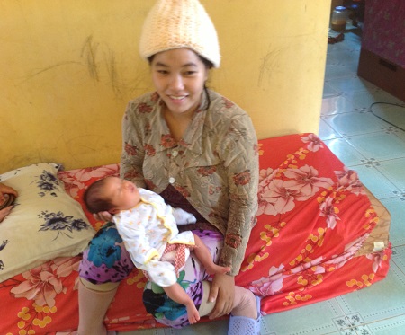 Chị Phan Thị Thương và bé gái Nguyễn Phan Ngọc Hân mới sinh trên đảo Trường Sa - Ảnh: N.H Chị Phan Thị Thương, vợ anh Nguyễn Minh Châu đã sinh bé gái Nguyễn Phan Ngọc Hân ngày 2/4/2014 tại Bệnh xã xã đảo Sinh Tồn. Bồng trên tay cháu bé còn đỏ hỏn, chị Thương ngồi tiếp chúng tôi với nét vẻ tươi cười, niềm nở, dường như không còn chút gì là dấu hiệu mệt mỏi của một sản phụ chỉ vừa mới qua cơn “vượt cạn”, mang nặng đẻ đau.