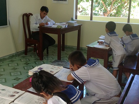 Một lớp học ở Trường Tiểu học Trường Sa - Ảnh: N.H. Nhìn các em đang gò lưng trên bàn để làm bài, trên mình mặc áo quần mang sắc phục hải quân, tôi hiểu về sứ mệnh bảo vệ biển đảo thiêng liêng mà các em sẽ mang vác, ngày mai. Thầy giáo Đồng Minh Hiệp quê ở huyện Diên Khánh, tỉnh Khánh Hòa, 24 tuổi, ra đảo làm giáo viên dạy lớp 1, Trường Tiểu học Trường Sa “khoe” với tôi rằng học sinh của thầy sớm có những kiến thức, hiểu biết về biển: “Gia đình các em là ngư dân. Các em biết về các loại cá rất nhanh: cá bò, cá dìa... Các em phân biệt được những con cá thuộc loại cá gì, biết được từng loại cá khi đánh lưới lên”. Khi tôi hỏi thầy rằng làm một thầy giáo ở đảo thì có gì khác với ở đất liền, thầy liền bộc bạch về tâm nguyện của mình với đảo Trường Sa: “Ra với đảo, trách nhiệm của mình nặng hơn, vì ở nơi đầu sóng ngọn gió mà. Nhưng mình thấy phấn khởi, vinh dự vì được công tác ở Trường Sa”. Tôi gợi chuyện tiếp: “Cho dẫu xa nhà nhưng chắc thầy nhận được những niềm vui, niềm động viên từ phía các em học sinh và phụ huynh học sinh ở đảo chứ?”. Đôi mắt thầy chớp chớp ánh lên niềm vui, thầy nói cả bằng mắt lẫn bằng lời tha thiết: “Các em có tinh thần học tập, nhạy và sáng ý, như chuyện phân biệt nhanh từng loại cá mà tôi vừa kể đó. Phụ huynh ở đây thường quan tâm đến nhà trường. Đánh cá lên, phụ huynh thường tặng cho các thầy, mà toàn là những loại cá ngon như cá thu bè, cá hồng, cá đỏ... ”. Vui gặp những công dân tý hon của Trường Sa sớm mang sắc phục hải quân, biết thuộc từng loại cá biển như thuộc từng bài tập đọc, thuộc từng phép toán thầy giảng mỗi ngày, ôi thật đáng cảm mến và yêu thương quá đỗi, ôi thật đầy ước hẹn và tin tưởng cho ngày mai, hỡi những nụ mầm mới! Rồi cũng đến lúc con tàu chở chúng tôi ra quần đảo Trường Sa phải nhả từng bờm sóng đuôi tàu quẫy đạp trào dâng một nỗi gì da diết lắm để tạm biệt Trường Sa, trở về đất liền. Ở Trường Sa, tôi thấu hiểu nỗi lòng của những người lính, người dân đảo luôn hướng về đất liền.