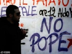 past a banner reading: "Against the Papacy" and "No Pope" at La Sapienza