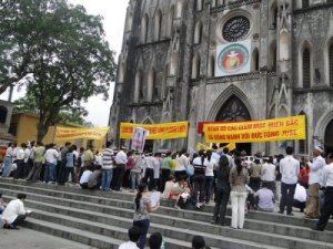 Bên ngoài nhà thờ: nhóm giáo dân biểu tình ủng hộ TGM Ngô Quang Kiệt,