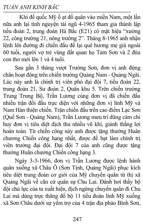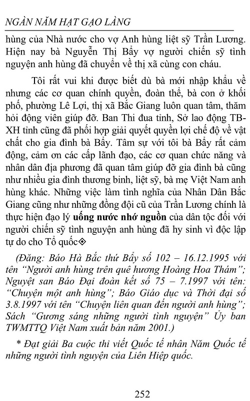 Cuộc Kháng Chiến Chống Mỹ Cứu Nước Có Phải Là Nội Chiến Hay Không? Tuấn Anh Kinh Bắc http://sachhiem.net/THOISU_CT/ChuN/NguyenTuanAnh_10.php Ngoài cái nhìn tăm tối, đớn hèn, tiêu cực khi viết về người lính trong cuộc kháng chiến chống chống Mỹ cứu nước trong NBCT, Bảo Ninh còn trực tiếp khẳng định đó là cuộc nội chiến, không có người chiến thắng. Đó là đoạn trả lời phỏng vấn của Bảo Ninh trong tập 9 bộ phim The Vietnam war (Chiến tranh Việt Nam) của đạo diễn người Mỹ Ken Burns và Lyun Novick, nói về giai đoạn chiến tranh từ tháng 5-1970 đến tháng 3-1973, (được công chiếu lần đầu 17.9.2017) tại thời điểm 15 phút 42” đến 16 phút 05”. Dưới đây tôi xin giới thiệu bài viết về tấm gương chiến đấu và hy sinh anh dũng của anh hùng liệt sỹ Trần Lương với quân đội Mỹ trên chiến trường Liên khu 5, nơi Bảo Ninh từng sống, để bạn đọc thấy rõ phẩm chất anh hùng của người chiến sỹ cách mạng- anh bộ đội Cụ Hồ và tự rút ra kết luận về cuộc chiến tranh chính nghĩa chống đế quốc Mỹ xâm lược hay cuộc nội chiến. (Bài viết đã đạt giải thưởng cuộc thi viết quốc tế 2001 về người tình nguyện do Liên Hiệp Quốc tổ chức nhân Năm quốc tế về người tình nguyện và được NXB Thanh Niên chọn in trong sách Ngàn năm hạt gạo làng của tác giả Tuấn Anh Kinh Bắc.)