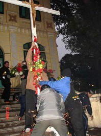 Sau khi nghe thánh ca xong thì đang khi người ta ra về như vậy thì có một người nào đó đứng lên loan báo rằng Đức Tổng Giám Mục mới gửi cho chúng ta một cái thư để xin cầu nguyện cho đất của Toà Khâm Sứ nhanh chóng được trả lại, chúng ta hãy cùng nhau tiến sang bên Toà Khâm Sứ để cầu nguyên. Lúc bấy giờ cả đoàn 4 người cầm nến người ta đi và 2 ngàn người còn lại người ta tiếp tục sang bên đó người ta cầu nguyện. Không có đả đảo, không có hô hào, không có bạo động, rất là nghiêm trang, hát kinh hoà bình." 2- Tăng áp lực trong vụ Tòa Khâm sứ BBC - 06 Tháng 1 2008 - Cập nhật 13h03 GMT Hàng trăm người theo Công giáo tiếp tục thắp nến cầu nguyện bên ngoài nơi từng là tòa Khâm sứ tại số 40 Nhà Chung, Hà Nội, trong dịp cuối tuần này. Dù trời rét, các giáo dân này vẫn tới đây đặt hoa, thắp nến và hát thánh ca bên ngoài tòa Khâm sứ cũ để đòi lại khu đất mà chính quyền lấy quản lý từ 50 năm trước. Khu vực này gồm một tòa biệt thự kiểu Pháp và khoảng một hécta đất xung quanh, từng được cho sử dụng để kinh doanh và cả làm bãi để xe. Nay người Công giáo muốn đòi lại phần đất mà trước kia đại diện tòa thánh Vatican dùng làm trụ sở. Đức Tổng Giám mục Hà Nội Ngô Quang Kiệt nói với BBC trong một cuộc phỏng vấn rằng đây là đất của tòa Giám mục cho Đức Khâm sứ mượn, vì vậy tòa Giám mục có quyền đòi lại.