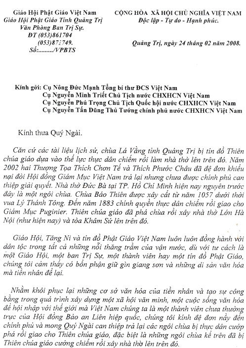 Căn cứ các tài liệu lịch sử, chùa Lá Vằng tỉnh Quảng trị bị tín đồ Thiên chúa giáo dựa vào thế lực thực dân chiếm rồi làm nhà thờ lên trên đó. Năm 2002 hai Thượng tọa Thích Chơn Tế và Thích Phước Châu đã đệ đơn khiếu nại đòi Hội đồng Giám Mục Việt Nam trả lại nhưng chưa được chính phủ can thiệp giải quyết. Nhà thờ Ðức Bà tại TP. Hồ Chí Minh hiện nay nguyên trước đây là một ngôi chùa. Chùa Báo Thiên được xây cất từ năm 1057 dưới thời vua Lý Thánh Tông. Ðến năm 1883 chính quyền thực dân chiếm rồi giao cho Giám mục Puginier. Thiên chúa giáo đã phá chùa rồi xây nhà thờ Lớn Hà Nội (như hiện nay) và tòa Khâm Sứ lên trên đó. Giáo hội, Tăng Ni và tín đồ Phật Giáo Việt Nam luôn luôn đồng hành với dân tộc trong tất cả những nỗi thăng trầm của vận nước. Dù với tư cách là một Giáo Hội, một ban Trị Sự, một thành viên hay một tín đồ Phật Giáo, chúng tôi cảm thấy có bổn phận giữ gìn giang sơn và những di sản văn hóa mà tiền nhân để lại. Nhằm khôi phục những cơ sở văn hóa của tiền nhân và tạo sự công bằng trong quá trình xây dựng một xã hội văn minh, một cuộc sống văn hóa để hội nhập với thế giới mà Việt Nam chúng ta là một thành viên chưa thường trực của Hội đồng Bảo an Liện hiệp quốc, chúng tôi kính đệ đơn nầy đến chính phủ và mong Quý Ngài can thiệp trả lại các ngôi chùa bị thực dân cướp phá rồi giao cho Thiên chúa giáo, đặc biệt là các ngôi chùa kể trên đã bị Thiên chúa giáo cưỡng chiếm rồi xây nhà thờ lên trên đó. Ðồng thời, cũng xin chính phủ chính thức đề nghị Vatican và Hội Ðồng Giám Mục Việt Nam xin lỗi dân tộc và Phật Giáo Việt Nam về hành động cướp chùa để xây nhà thờ và tàn phá nhiều di sản văn hóa Việt Nam. Chính phủ nên cho phép chúng tôi tiến hành thủ tục đòi những thành phần cướp phá chùa để xây nhà thờ phải bồi thường xứng đáng để Phật Giáo có phương tiện tu tạo lại nguyên trạng những danh lam thắng cảnh ấy. Thiết nghĩ, đây cũng là một trong những nỗ lực chung của toàn dân đang khôi phục lại các cơ sở văn hóa nước nhà, nhất là chùa Báo Thiên trong quần thể văn hóa Thăng long. Trân trọng kính chào Quý Vị lãnh đạo.