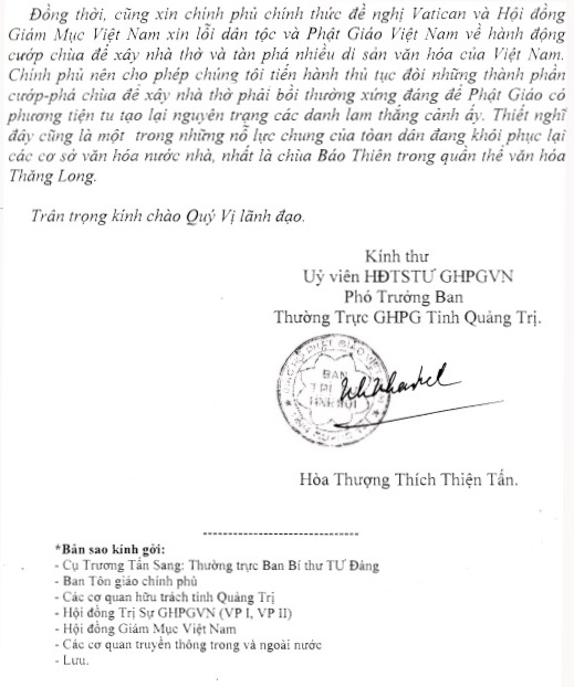 ▪ Bản sao kính gởi: - Cụ Trương Tấn Sang: Thường trực Ban Bí thư TƯ Đảng - Ban Tôn giáo chính phủ - Các cơ quan hữu trách tỉnh Quảng Trị - Hội đồng Trị sự GHPGVN (VP I, VP II) - Hội đồng Giám mục Việt Nam - Các cơ quan truyền thông trong và ngoài nước - Lưu