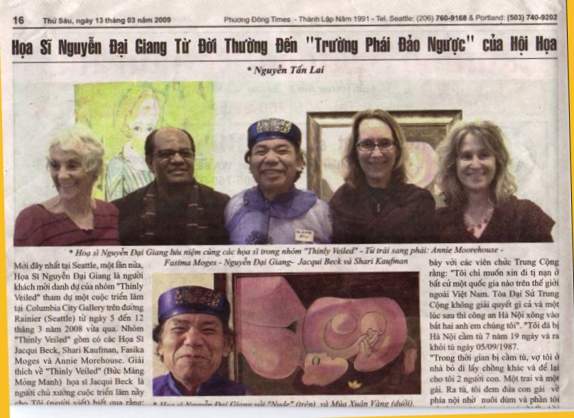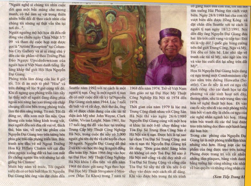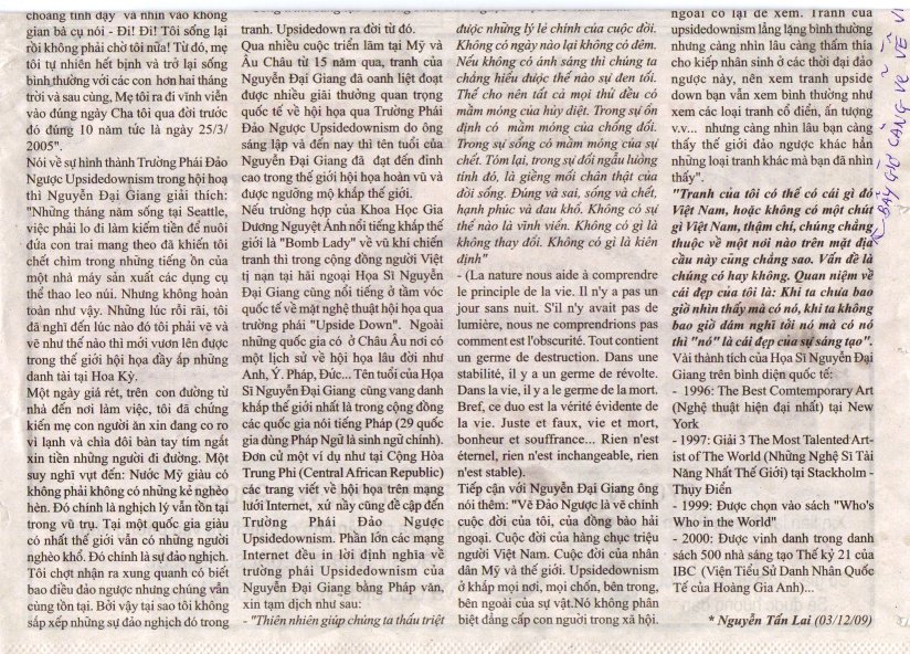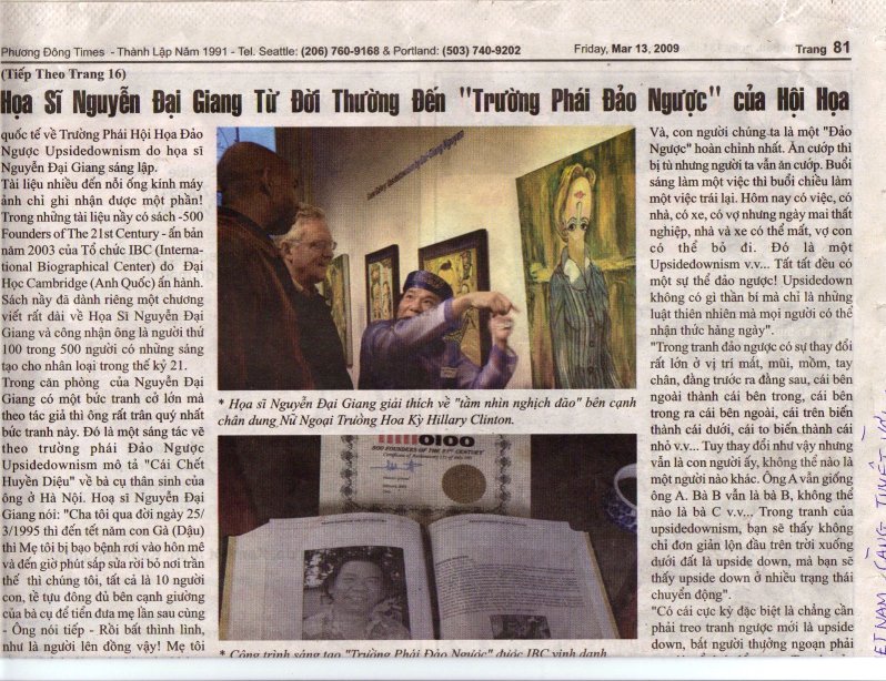 Hội Họa - "Nghệ Thuật Đảo Nghịch" Chen Chân Thế Giới SH https://sachhiem.net/VANHOC/Daigiang.php LTS: Sachhiem.net hân hạnh ghi lại những thành tựu của họa sĩ Đại Giang thể hiện trong trường phái hội họa đảo nghịch được nhiều giải thưởng quốc tế. Những cuộc triễn lãm Tranh Đảo Nghịch đã diễn ra ở nhiều nơi kể cả Washington State và NewYork từ lúc họa sĩ sáng tạo ra môn phái này. Sau đây là một vài trong các thông tin gần nhất về họa sĩ Đại Giang và các họa phẩm. 1. Báo quốc nội - 1 tháng trước 14Feb09- Từ đảo nghịch cuộc đời đến đảo nghịch hội họa (Tuổi Trẻ) - ..."Upsidedown ra đời năm 1993 và đến 1996 thì đoạt giải thưởng quốc tế và chính thức được Cục Bảo vệ bản quyền tác giả Mỹ công nhận. Ðến năm 2006 nó đã dần dần ... 2. Báo quốc ngoại 14Mar09.