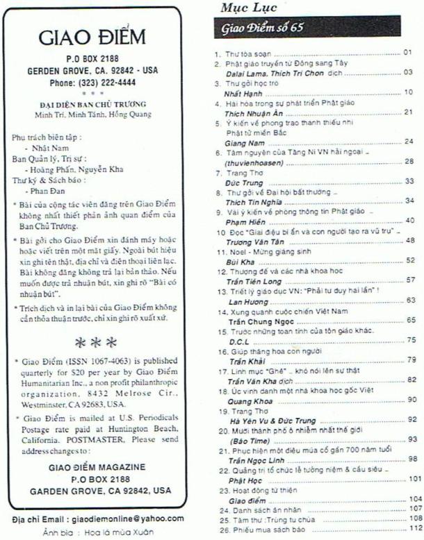 6. PVSH: Đúng thế. Nhưng có lẽ chính tờ Giao Điểm #65 sẽ nói lên tât cả câu trả lời cho vấn đề này, anh có thể cho biết nội dung tờ Giao Điểm #65 không ? - BHQ: Vâng, xin gửi chị xem Mục Lục của GÐ # 65 để có thể biết nội dung tờ báo.