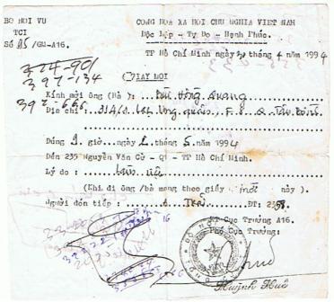 2. PVSH: Như vậy việc xin phép của anh bắt đầu như thế nào ? BHQ: Đây là lần đầu tiên đem ra một số lượng hơn vài trăm số báo nên không biết phải xin như thế nào và xin cơ quan nào. Do vậy, tôi nhờ người quen, ông ta xin giúp chứ không lấy tiền. Ông còn nói: "gia đình tôi Phật giáo thường làm việc từ thiện, nên xin giúp ông Quang như là một việc từ thiện vậy." Như tất cả mọi người, muốn ra vào một quốc gia nào, bao gồm Việt Nam, thì phải xin phép và theo thủ tục luật lệ của quốc gia đó, chứ không thể làm khác. Tôi đã bị một kinh nghiệm đáng nhớ. Năm 1994, tôi đem một cuốn băng cassette về việc từ thiện, và bị chận tại phi trường TSN. Sau đó bị “mời” lên làm việc 3 ngày tại Bộ Nội Vụ TP. HCM, bị cáo buộc đủ điều (tôi vẫn còn giữ bản phóng ảnh giấy “Mời”). Năm sau, công an Huế cũng “Mời” một lần. Vì thế, lần nầy đem vài trăm số báo, tôi phải thận trọng.