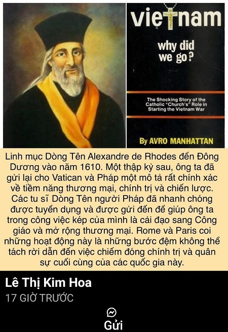Nhưng sâu xa hơn là thằng giáo sĩ Đắc Lộ tức Rốt, giáo sĩ Dòng Tên, người Pháp đã viết trong quyển *Phép Giảng Tám Ngày* bôi nhọ, chống phá Văn Hóa tuyền thống của Dân Tộc VN.