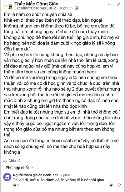 Nhà em đi theo đạo (bên nội theo đạo, bên ngoại không) nhưng em không theo từ bé. Bố mẹ em cũng đã từng bắt em nhưng ngay từ nhỏ e đã cảm thấy mình không phù hợp để theo. Rồi đến tuổi lập gia đình, bố mẹ và họ hàng bên nội doạ là đám cưới k học giáo lý sẽ không đến tham dự.