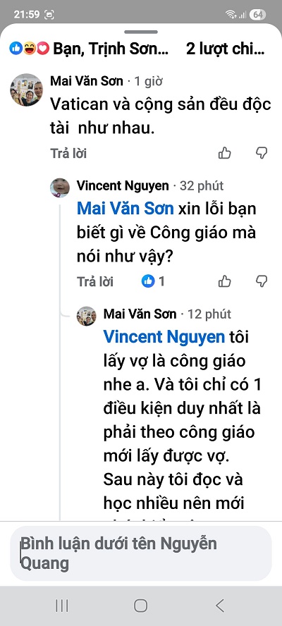 Mày không thích vô đạo thì ai ép mày? Mắc mớ gì mày lấy người Công Giáo làm gì? Mày lợi dụng đi học đạo để lấy được vợ. Rồi mày quay qua mày chửi Vatican độc tài. Xưa giờ thấy mày cũng đàng hoàng. Nhưng mày đụng tới tôn giáo thì mày khốn nạn thật.
