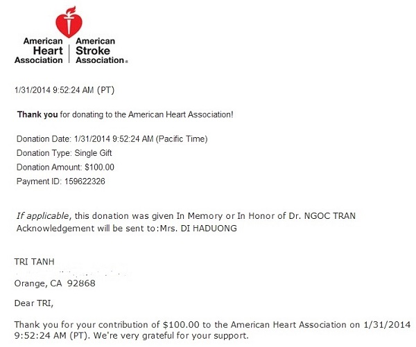 Ảnh dưới đây là biên nhận của Heart Association gửi cho vài thân hữu vừa gửi tặng tài vật cho Hội. Chúng tôi cũng sẽ đăng tất cả các biên nhận tương tự như thế nếu có bạn đọc nào gửi ảnh chụp hay tờ biên nhận cho chúng tôi.