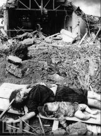 Ảnh phải: Nạn nhân của một vụ đánh bom do máy bay Mỹ vào Hà Nội và hải cảng Hải Phòng năm 1972.