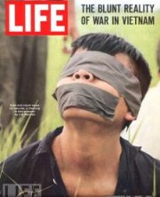 Ảnh trái: Hình trái, một tù binh Việt Cộng bị U.S. Marine bắt giữ trong một trận chiến tại Cap Batangan, gần Đà Nẵng. Mắt và miệng đều bị dán băng keo. Báo phát hành ngày 26 tháng 11, 1965.