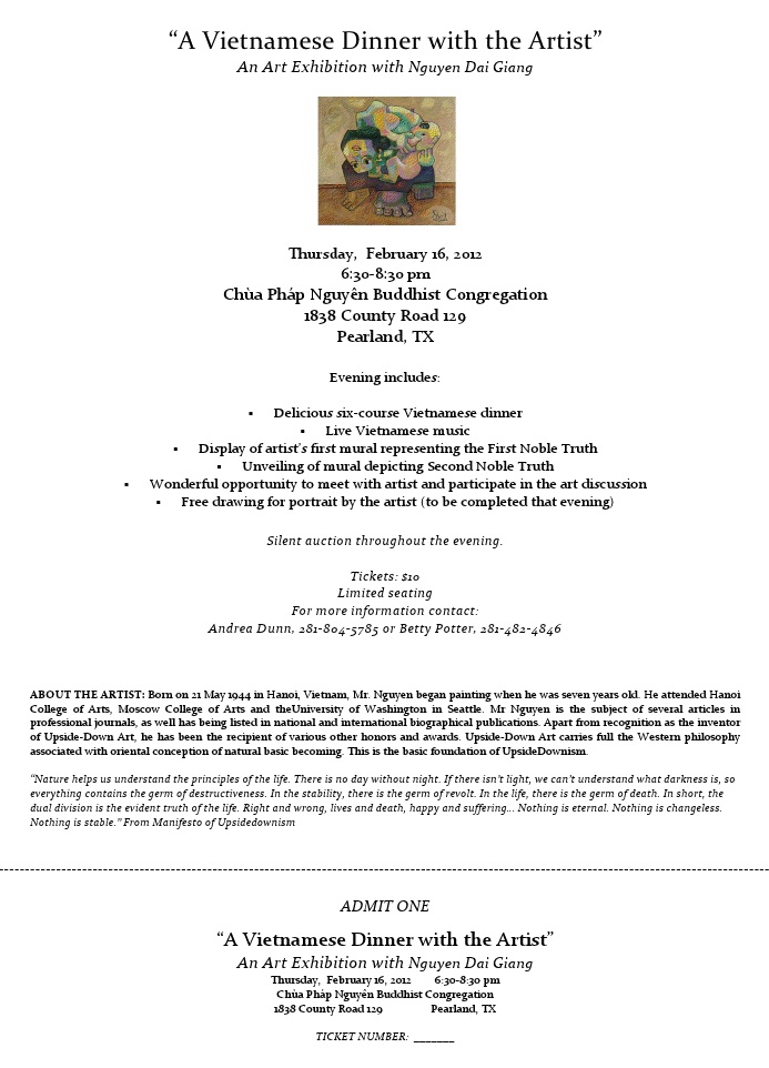 Những người Mỹ yêu thích hội họa đã tổ chức một cuộc triễn lãm tranh upsidedownism vẽ về Phật giáo nhân dịp họa sĩ Nguyễn đại Giang hoàn thành 2 bức tranh treo tường, mỗi một tranh có kích thước 6' x 19'.