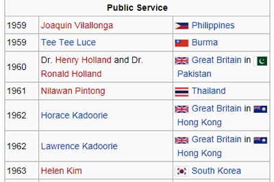 - Về Phục-Vụ Quần-Chúng thì có Linh-Mục Augustine Nguyễn Lạc Hóa của Việt-Nam Cộng-Hòa được giải vào năm 1964.