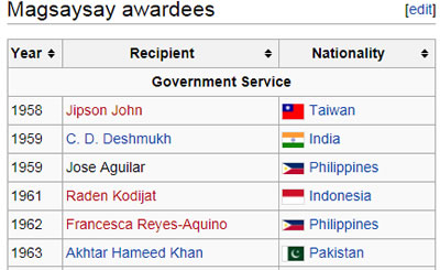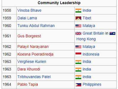 Tôi tra-cứu nhiều nguồn tài-liệu, thấy trong Từ-Điển Bách-Khoa Wikipedia có danh-sách các vị được Giải Lãnh-Đạo Magsaysay từ năm thành-lập 1957 (phát Giải từ năm 1958) trở về sau :