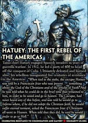 “Chief Hatuey dẫn một số người đi trốn nhưng bị bắt và bị thiêu sống. Khi họ trói Hatuey vào một cái cọc, một họ đạo dòng Franciscan kêu gọi Hatuey hãy mang chúa Jesus vào trong trái tim, để sau khi chết, có thể lên thiên đàng, thay vì đi xuống địa ngục.” Hatuey trả lời: “Nếu thiên đàng là nơi mà người đạo Thiên Chúa chọn để tới sau khi chết, thì tốt hơn tôi phải chọn xuống địa ngục!..”