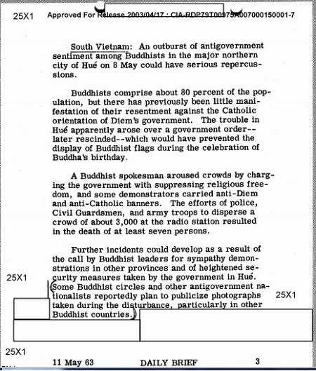 Nơi đây sẽ dịch riêng phần về Việt Nam, trong đó ghi rằng, khi giải tán đám động 3,000 Phật Tử, trách nhiệm thảm sát tại Đài Phát Thanh Huế là do 3 lực lượng: Cảnh Sát, Dân Vệ và Quân Đội. Hồ sơ CIA nơi đây cũng nói: chính sách của chính phủ ông Diệm là thiên vị Thiên Chúa Giáo, nhưng Phật Từ trước giờ vẫn lặng lẽ chịu đựng, cho tới khi xảy ra biến động Huế.