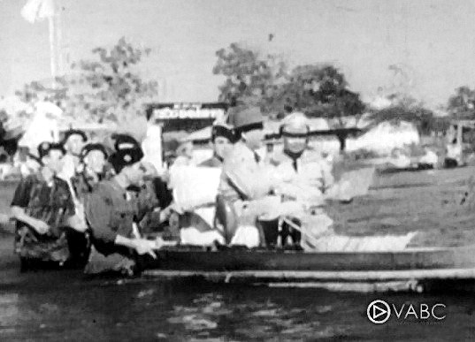 Sĩ quan Quân đội VNCH bị xem như gia nhân, lội nước đẩy thuyền cho Tổng thống, số quân nhân còn lại đứng dưới nước dàn chào (1961).