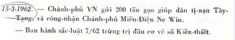 ● Vào ngày 19-12-1960, Thủ Tướng Shri Jawaharlal Nehru xác nhận rằng ngoài 3 chính phủ khác (Úc, Mỹ và Tân Tây Lan) tặng hiện kim, chính phủ Việt Nam Cộng Hòa đã tặng (donated) 1,300 tấn gạo cho chính phủ Ấn Độ (at the disposal of Government of India) để cứu trợ dân tỵ nạn Tây Tạng.