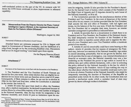 Dưới đây là phần Việt dịch của Bản Ghi nhớ đề ngày 16 tháng 8 năm 1963 mà Phó Giám đốc Kế hoạch CIA (Richard Helms) gửi cho Phụ tá Ngoại trưởng đặc trách Viễn đông Sự vụ (Roger Hilsman) để lượng giá về tình hình tại Nam Việt Nam, trong đó có đính kèm hai Bản Phụ Đính (Attachment), phân tích khả năng ông Nhu có thể lên thay thế ông Diệm, và từ đó mô tả bộ máy quyền lực hổn loạn của ba anh em nhà Ngô.