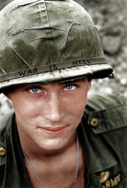 Bức ảnh chụp người lính Mỹ Larry Wayne Chaffin đội mũ có dòng chữ "Chiến tranh là địa ngục" ngày 18/6/1965 là một bức ảnh nổi tiếng khác của Horst Faas. Ảnh: AP